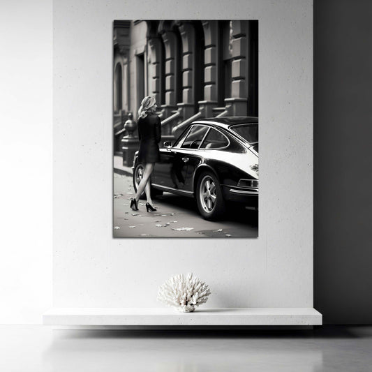 Retro Auto mit eleganter Frau schwarz weiß Wandbild
