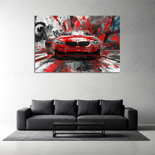 Rotes Auto BMW Street Art Wandgrafik mit Rennoptik Wandbild