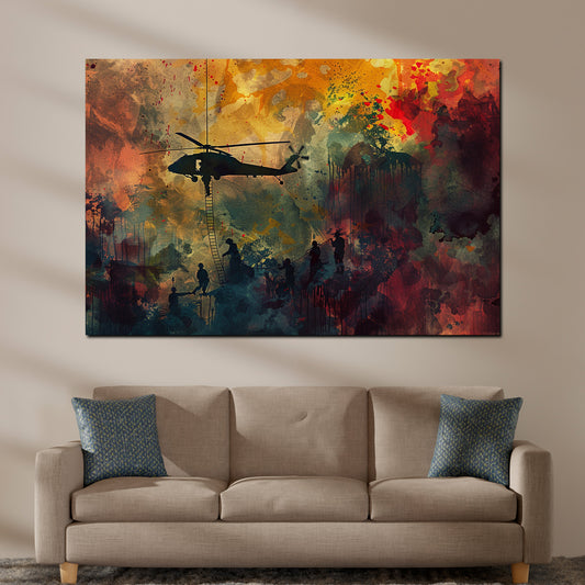 Feuerwehrmänner im Einsatz abstrakt mit Hubschrauber Wandbild Kunstwerk
