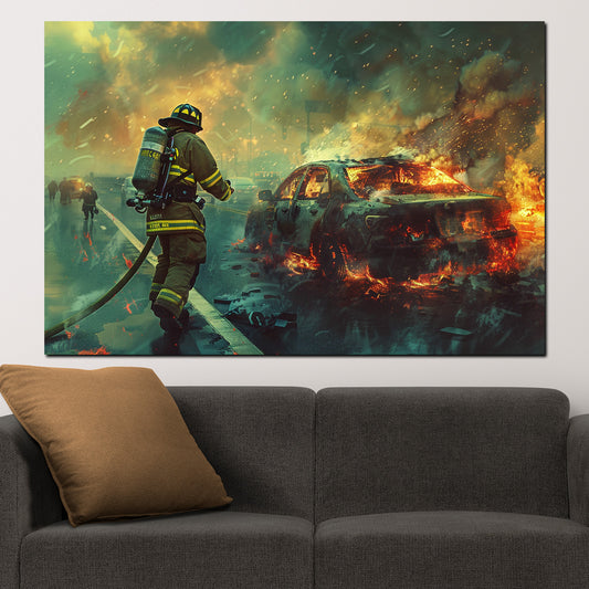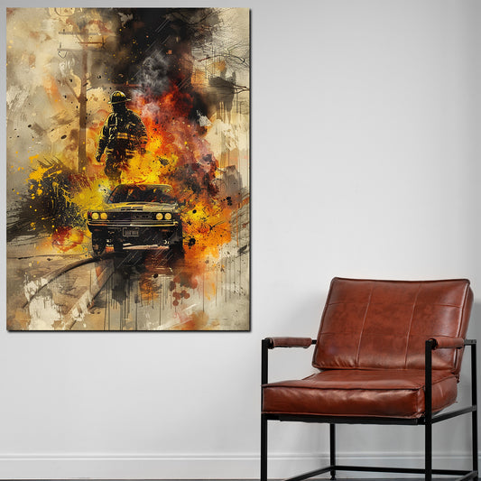 Abstrakt Feuerwehrmann im Einsatz löscht brennendes Auto Wandbild Kunstwerk