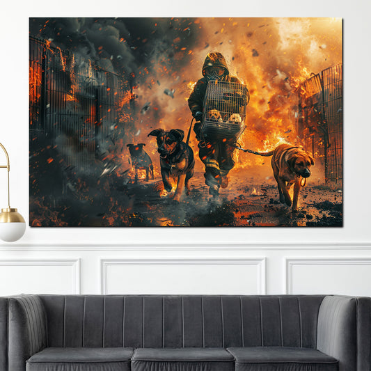 Abstrakt Feuerwehrmann im Einsatz rettet Hunde Wandbild Kunstwerk