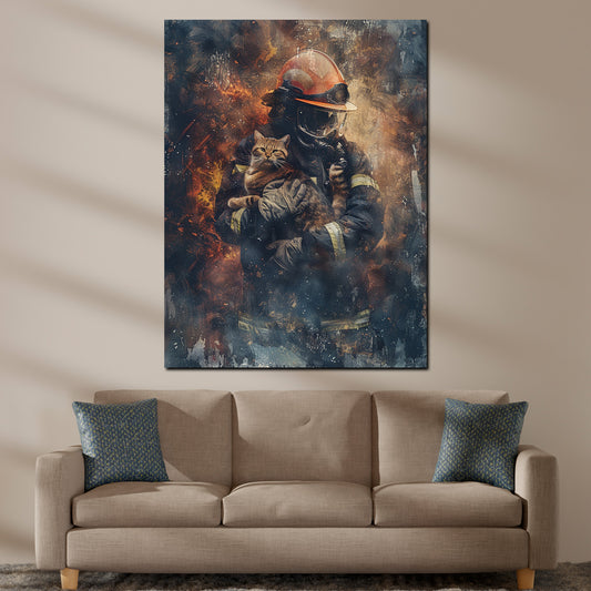 Abstrakt Feuerwehrmann im Einsatz rettet Katze Wandbild Kunstwerk