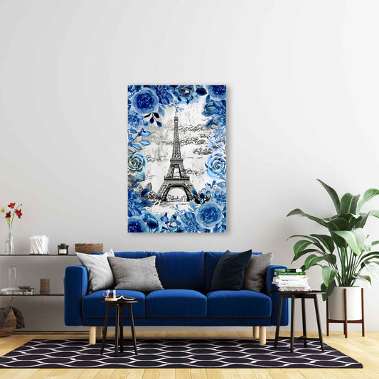 Eiffelturm in blauen Blumenrahmen Wandbild Kunstwerk