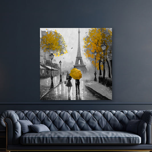 Paar mit Regenschirm in Paris goldenen Akzenten Wandbild Kunstwerk