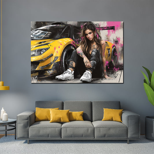 Pop Art tätowierte Frau und Sportauto Wandbild Kunstwerk