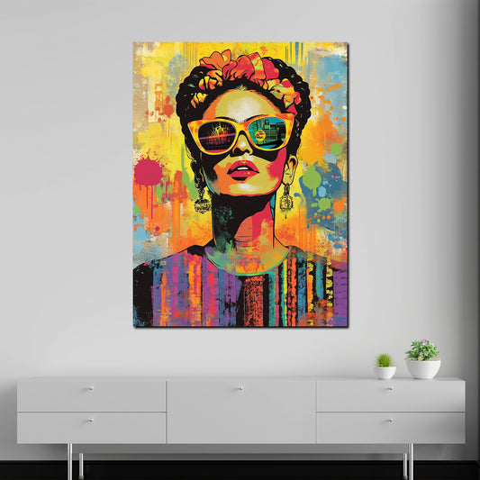Pop Art Frida im modernen Stil mit leuchtenden Farben und Brille Wandbild Kunstwerk