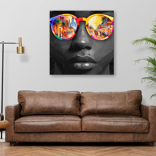 Gesicht Schwarz weiß mit farbiger Sonnenbrille Wandbild Kunstwerk