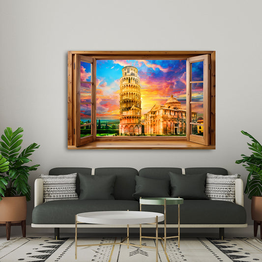 Italien Pisa mit schiefem Turm durch ein offenes Fenster Wandbild Kunstwerk