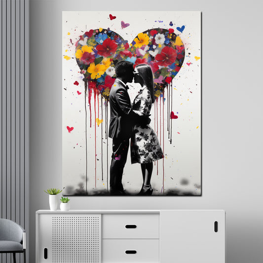 Street Art Liebespaar mit Herz aus Blumen Wandbild Kunstwerk