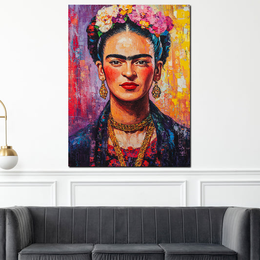Pop Art Frida mit Blumen und Farben im Stil Wandbild Kunstwerk