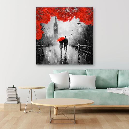 Paar mit rotem Regenschirm und roten Bäumen Wandbild Kunstwerk