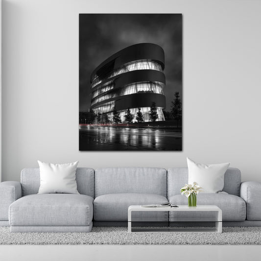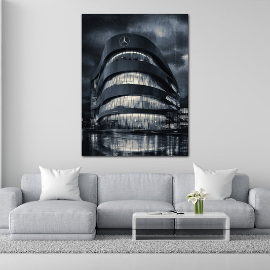 Mercedes Museum Stuttgart Regenstimmung schwarz weiß Wandbild