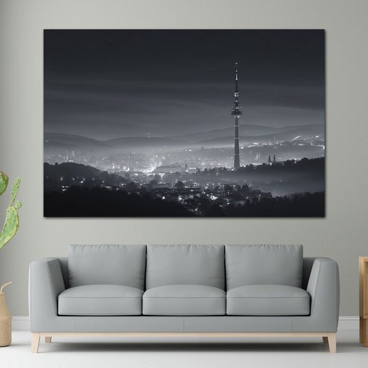 Fernsehturm Stuttgart Stadtlandschaft nachts schwarz weiß Wandbild