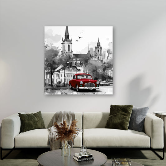 Roter Oldtimer in schwarz weiß City Wandbild Kunstwerk