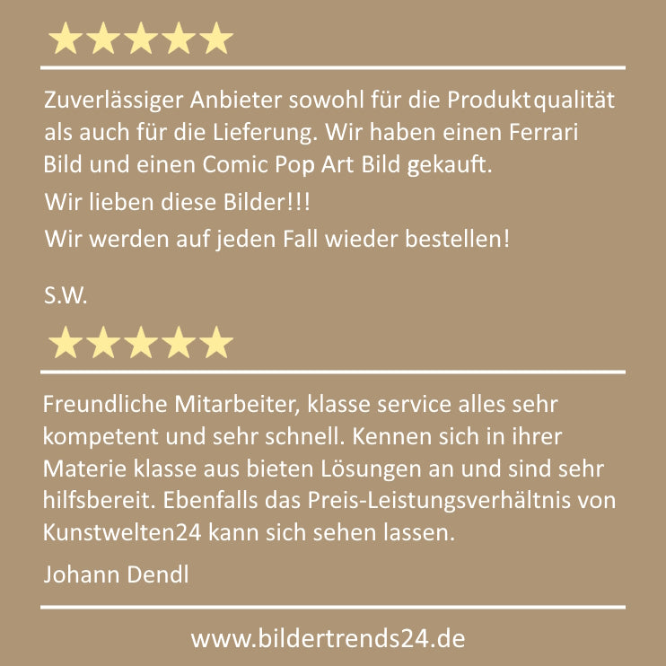 Alle Kunstdrucke auf Bildertrends24 sind aus zertifizierter europäischer Produktion und werden in Deutschland mit höchster Qualität gefertigt. Wir bieten Ihnen eine 30-Tage-Zufriedenheitsgarantie – sollte der Kunstdruck nicht Ihren Erwartungen entsprechen, können Sie ihn unkompliziert zurücksenden.