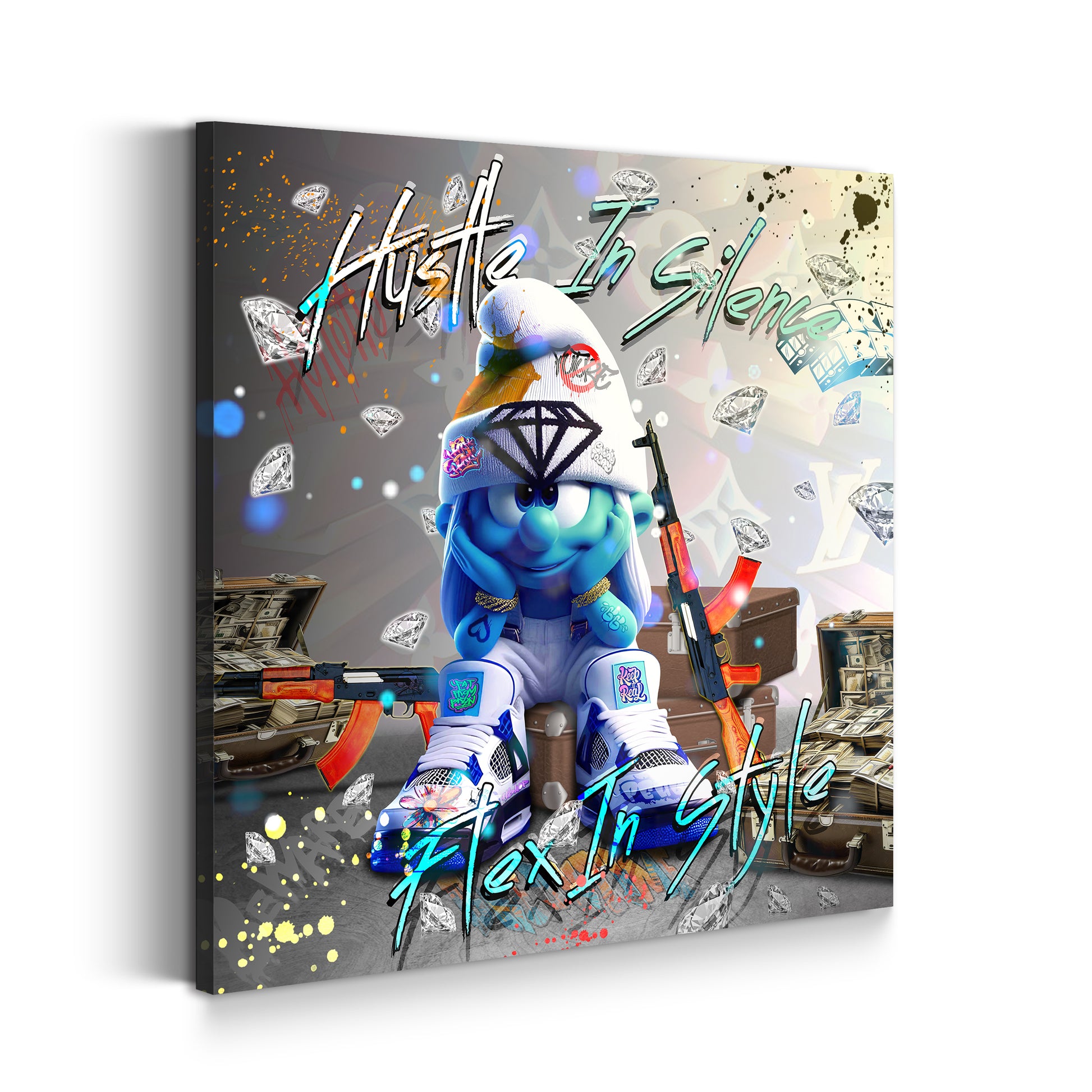 Blaue Comicfigur mit Geld und Luxus Style Wandbild