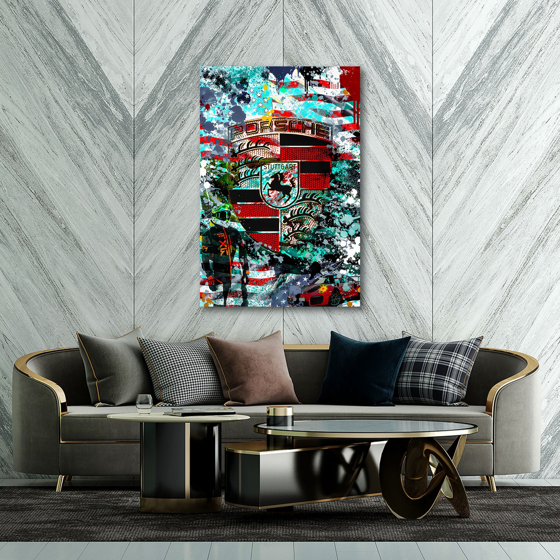Porsche Emblem Rennfahrer Farbexplosion Wandbild