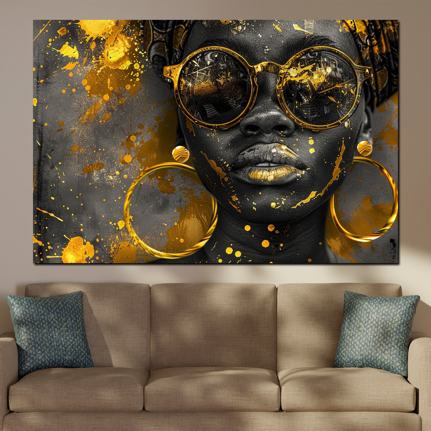 Afrikanische Frau mit goldener Brille und Ohrringen modern Wandbild Kunstwerk