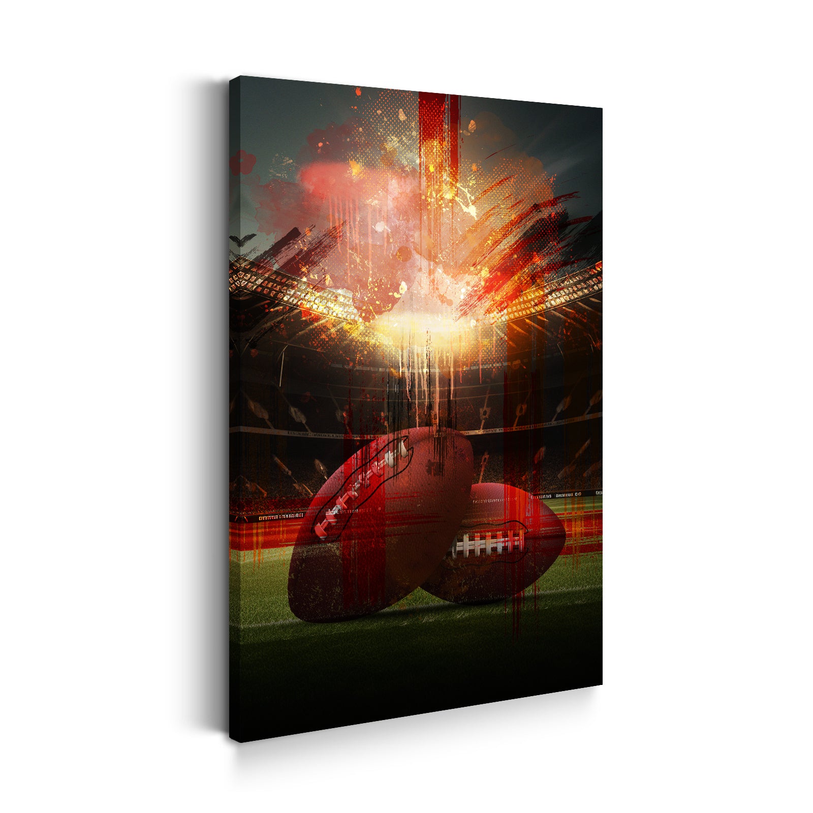 Footballs im Stadion mit dynamischen Licht- und Explosionseffekten Wandbild Kunstwerk